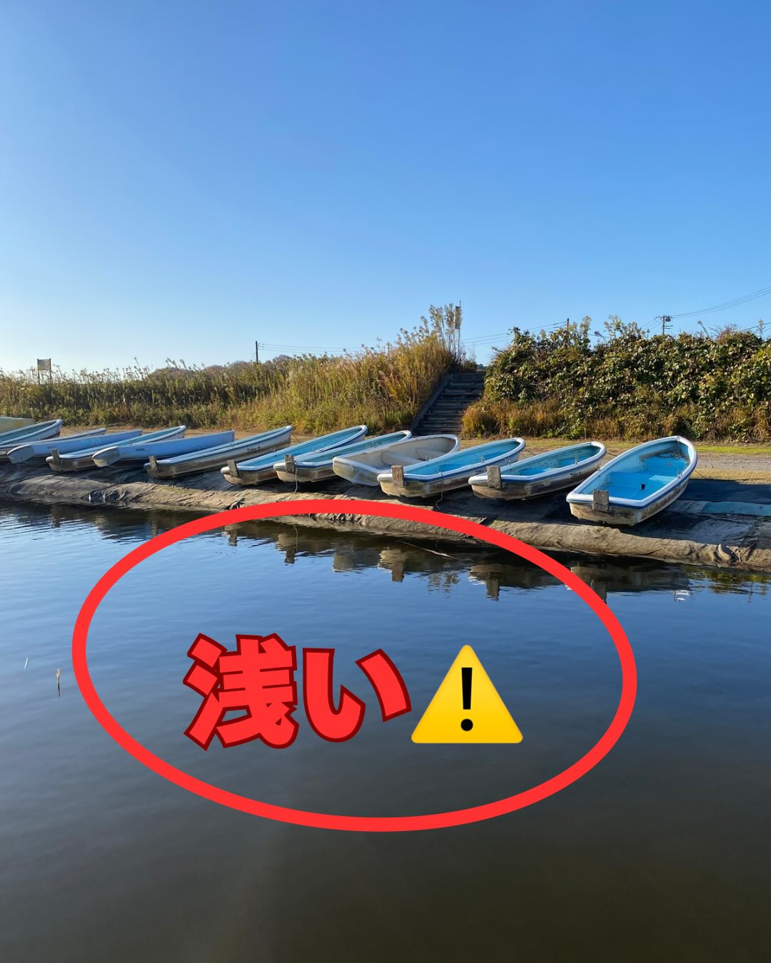 現在、冬の低水位の為に乗り場前は大変浅くなっているのでエレキのシャフトは上げて航行するかオールをご利用ください。